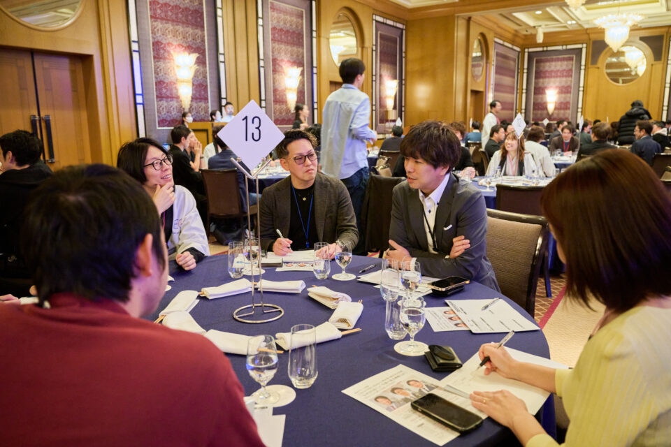 ピッチの後は、各テーブルで参加者同士がワークシートを使って自社の採用課題や成功体験をシェアし合う時間が設けられました。160名が10人前後のテーブルに分かれ、自社の採用にまつわる経験を赤裸々に共有する──こうしたピアラーニングの場は、EOならではの醍醐味です。